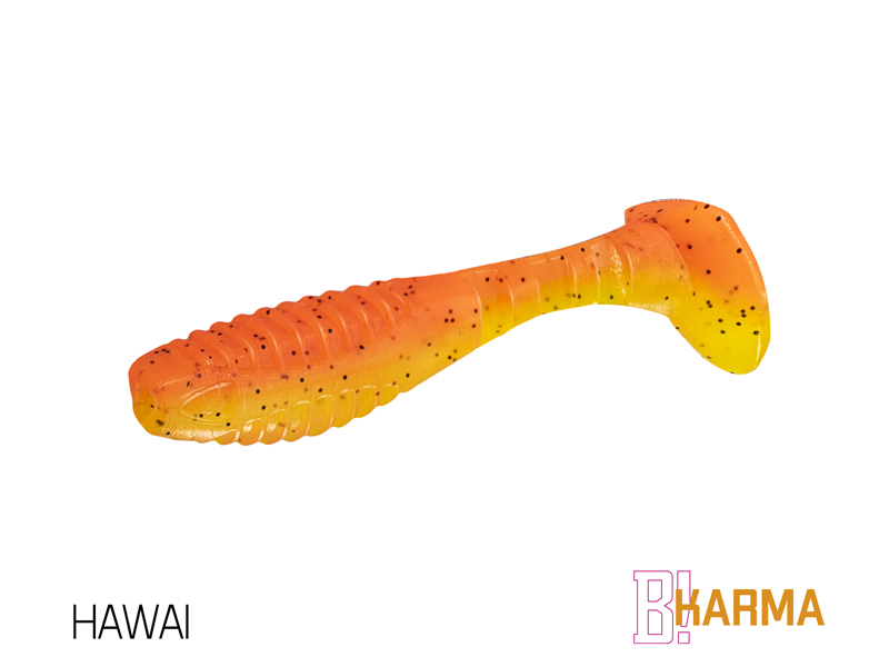 Od początku projektowaliśmy KARMA jako nietypowy model klasycznego produktu. Naszym celem było stworzenie wszechstronnej przynęty, ale zrobienie tego na swój własny sposób. Pierwszą rzeczą, jaką można zauważyć, jest niezwykły stosunek ogona do ciała. Większy ogon powoduje nietypowy ruch przynęty, kiedy ogonek porusza się, a tułów delikatnie przetacza się z jednej strony na drugą, imitując zranioną ofiarę. Taki ruch niezwykle dobrze przyciąga ryby i daje nowe możliwości prezentacji przynęty. Pomiędzy tułowiem a ogonem znajdują się trzy nacięcia dodające bardziej naturalnego wyglądu, a sam tułów jest ząbkowany na brzuchu i tylnej części. Ten rodzaj powierzchni zwiększa wibracje w wodzie i z powodu nacięć; zawsze widać, gdzie włożyć haczyk i gdzie opuszcza ciało. Przednia część przynęty posiada nacięcie, aby lepiej dopasować główkę jigową.