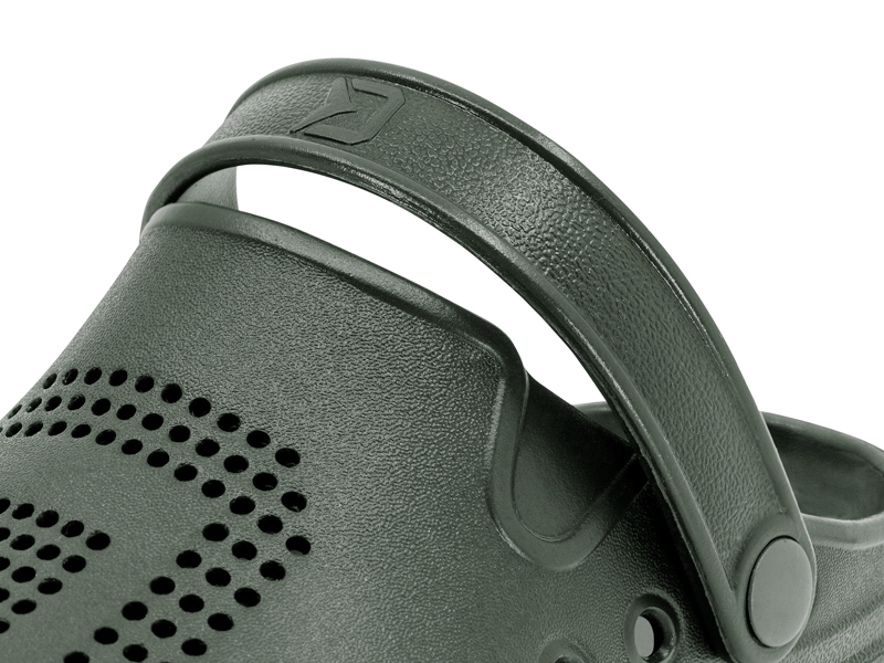 Kolejnymi wyszukanymi elementami są duże boczne otwory, których rolą jest zadbanie o wentylację i ogólną przewiewność tych butów. Nie są one celowo zaprojektowane na niskim poziomie, jak to jest w standardzie, ale nieco wyżej. To właśnie ten szczegół odgrywa ważną rolę podczas pobytu na brzegu lub w płytkiej wodzie. Dzięki temu, że otwory znajdują się nieco wyżej nad wkładką, niepożądane nagromadzenie piasku lub kamieni między podeszwą a stopą jest prawie wyeliminowane. Dzięki temu Twoje stopy są jak najlepiej chronione. Oprócz tych otworów wentylacją jest gruba perforacja znajdująca się w górnej części. Jest celowo ukształtowana z jednej strony w symbol D z logo Delphin, a z drugiej symbol O jako początkowa litera nazwy OCTO. Całkowite wrażenie dodatkowo potęguje delikatna struktura powierzchni podeszwy, która przywodzi na myśl skórę kałamarnicy. Dzięki zastosowanemu materiałowi EVA są niezwykle lekkie, wytrzymałe, a nawet unoszą się na wodzie. Oczywiście ten model posiada pętlę do mocowania pięty (popularnie nazywaną zapięciem), co docenisz zwłaszcza w nierównym lub pochyłym terenie.