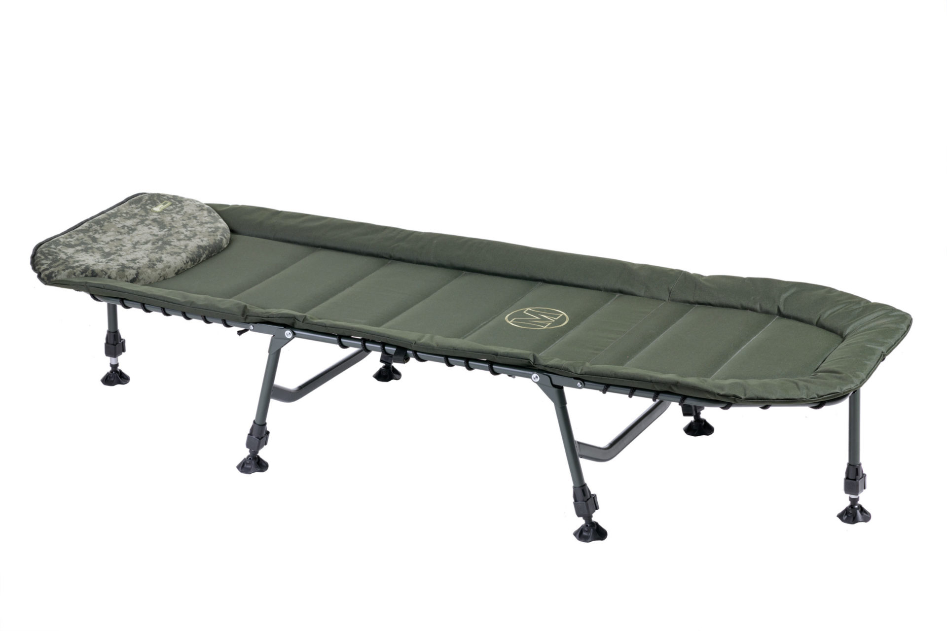 Compact and completely flat bedchair with a comfortable and rigid mattress. It offers an excellent stability of eight-leg bedchairs combined with reduced weight and simplicity of opening and folding. All this at a very interesting price level with uncompromising quality of workmanship and materials used. The bedchair is equipped with self-extending legs and swinging mud feets. The front and rear individual legs are equipped with an automatic folding / unfolding lock. The distance connecting parts between the main sections of the frame allow this bedchair to be folded with a sleeping bag attached.
