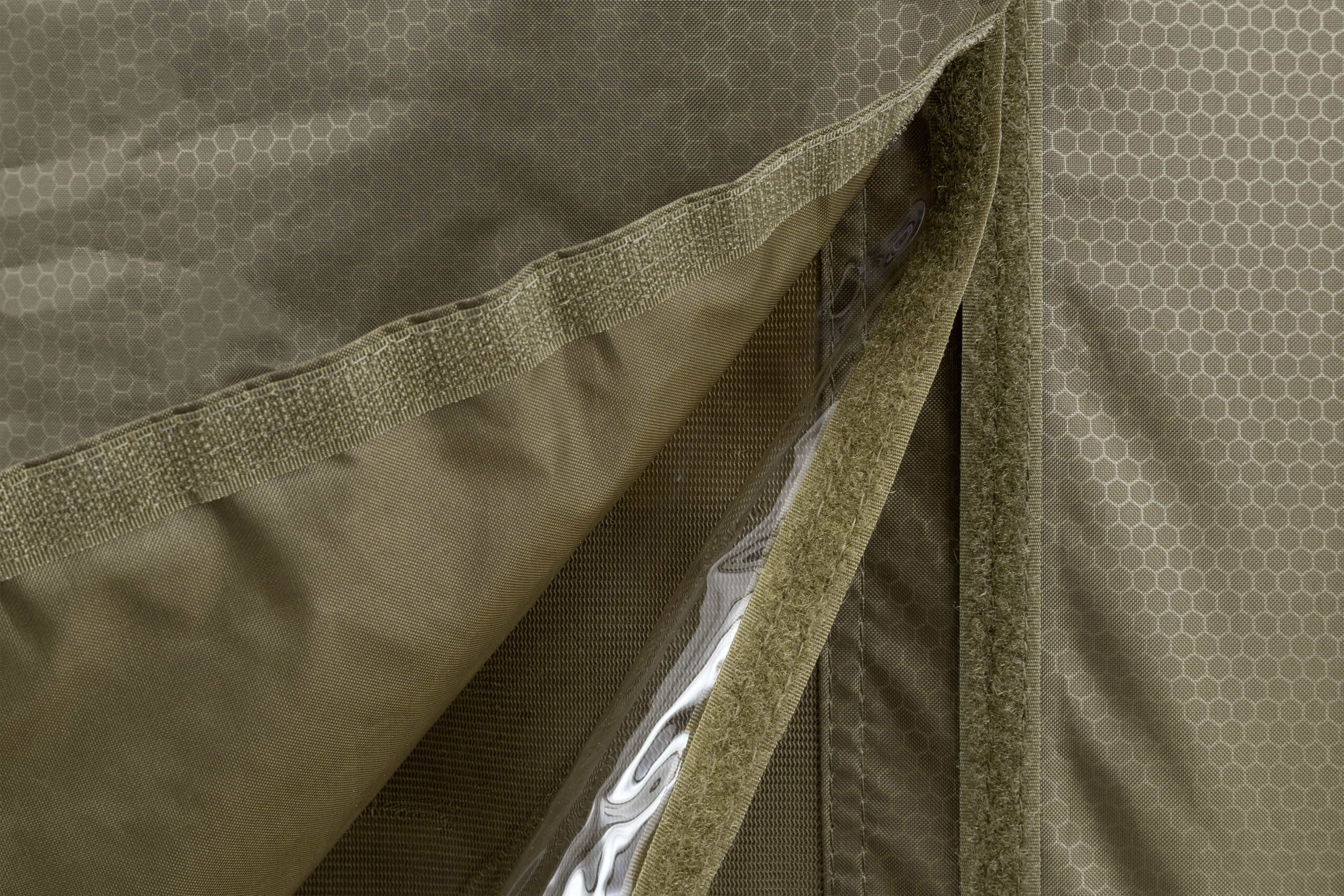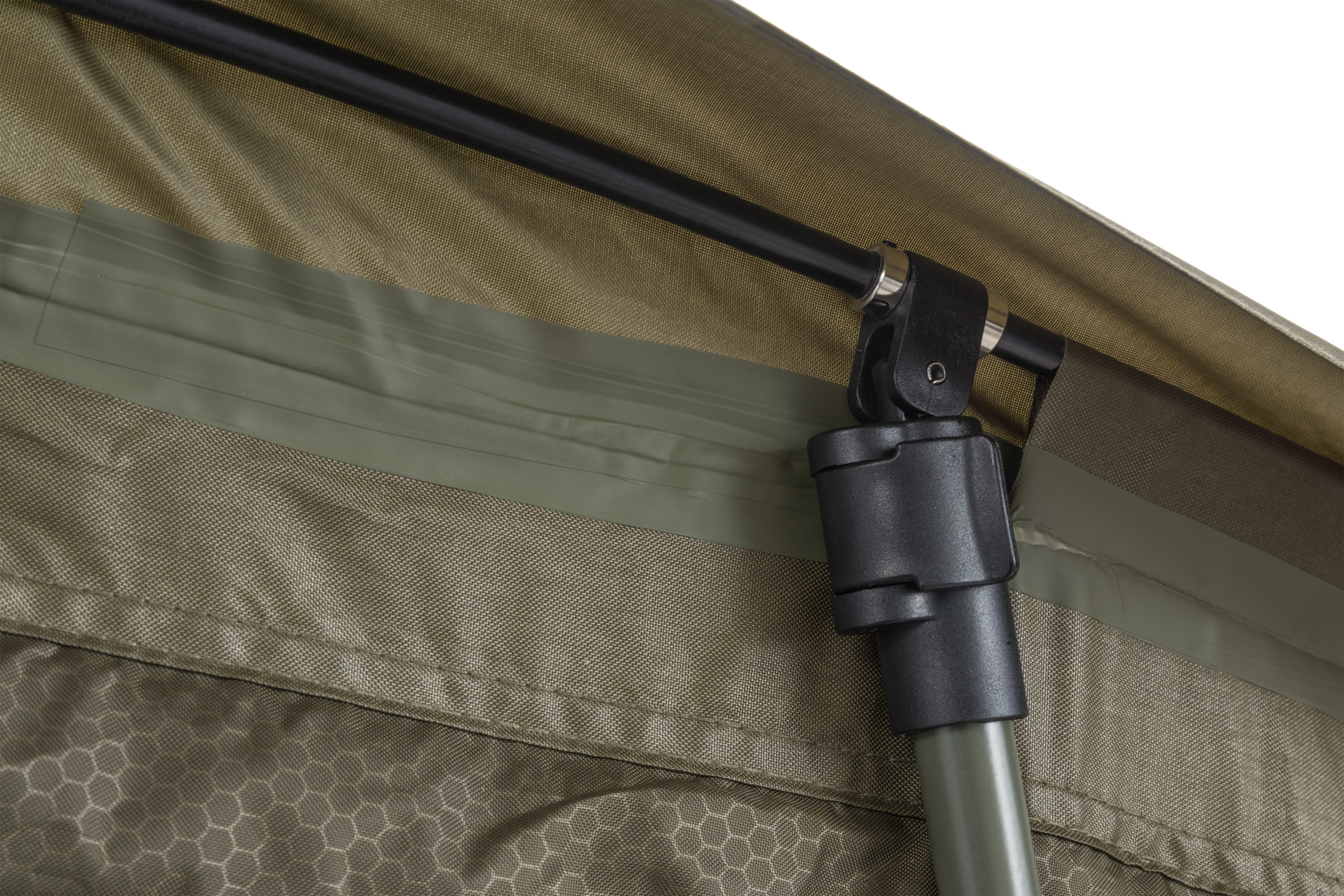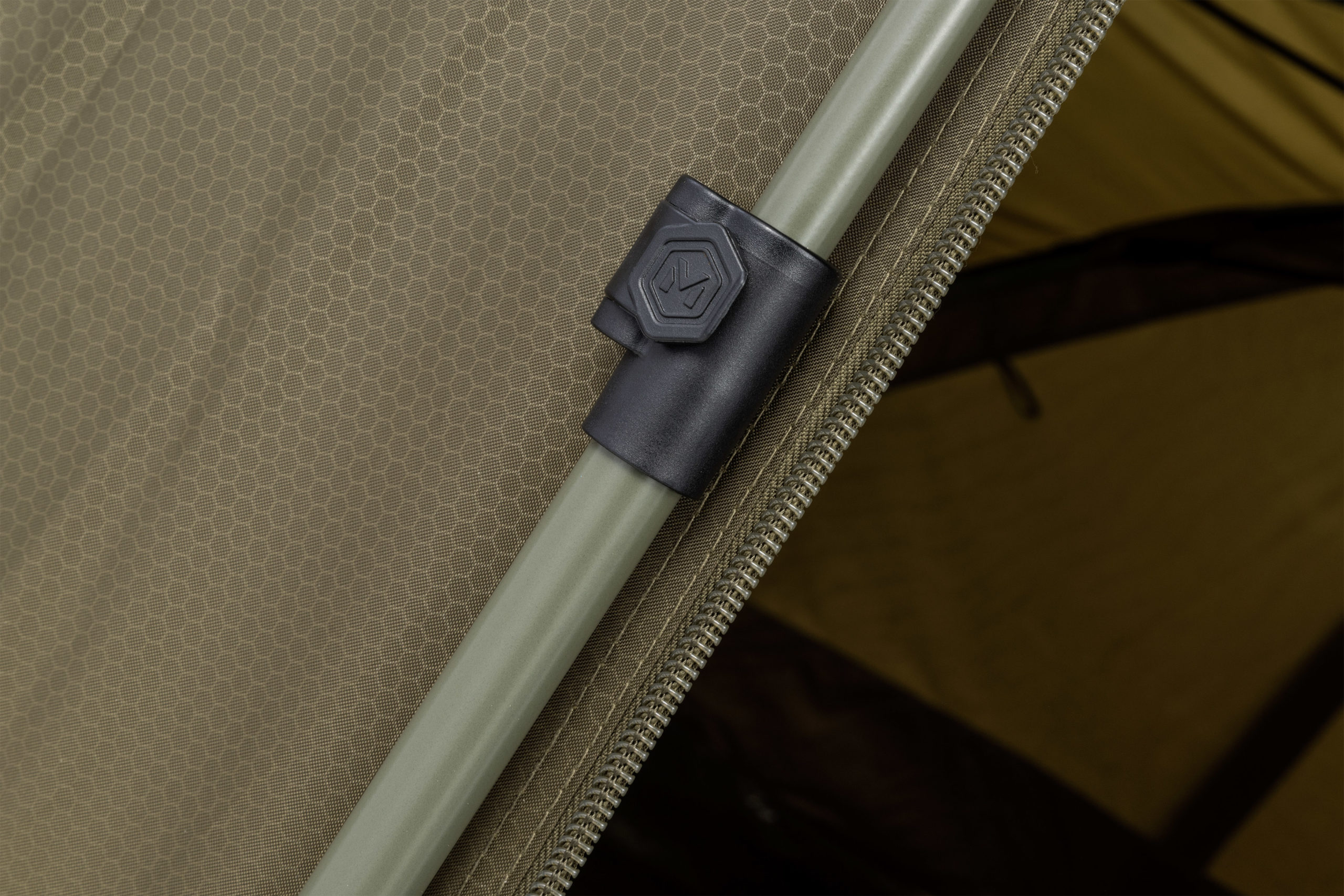 Innovative and extra large brolly refined down to the last detail by the Mivardi brand. It retains the classic umbrella-style construction but uses a space-saving central block, which maximises headroom when sitting on a bedchair. This brolly introduces a series of unique and innovative structural solutions that significantly increase the internal space, improve stability, and speed up both setup and pack-down. A special feature of this brolly is the extended two-section rear ribs, which can be folded for transport — but do not have to be. Together with the optimised geometry of the remaining ribs, they create an exceptionally large internal area with an almost rectangular footprint. The Entrix Brolly in the MK2 version offers one of the largest interior spaces on the market. This allows it to be used even with the biggest bedchairs while still leaving plenty of room for a table, luggage, and other equipment. The front section is reinforced and stabilised by a two-section fibreglass pole with a uniquely designed locking system. The structure above the entrance forms a protective peak that shields the doorway from rain. The front window is three-layered (mosquito mesh / clear PVC / nylon cover). The entire front panel can be fully removed. The M-TEC300 outer fabric with a hexagonal texture now features a 10,000 mm waterproof rating and increased mechanical durability. Four included storm poles are equipped with quick-connect adaptors for very fast and easy attachment to the brolly frame. They also feature the new Mivardi locks with extremely strong clamping force, ensuring perfect tensioning of the brolly cover. The Entrix Brolly MK2 is supplied as a complete set, including a groundsheet and a front panel.