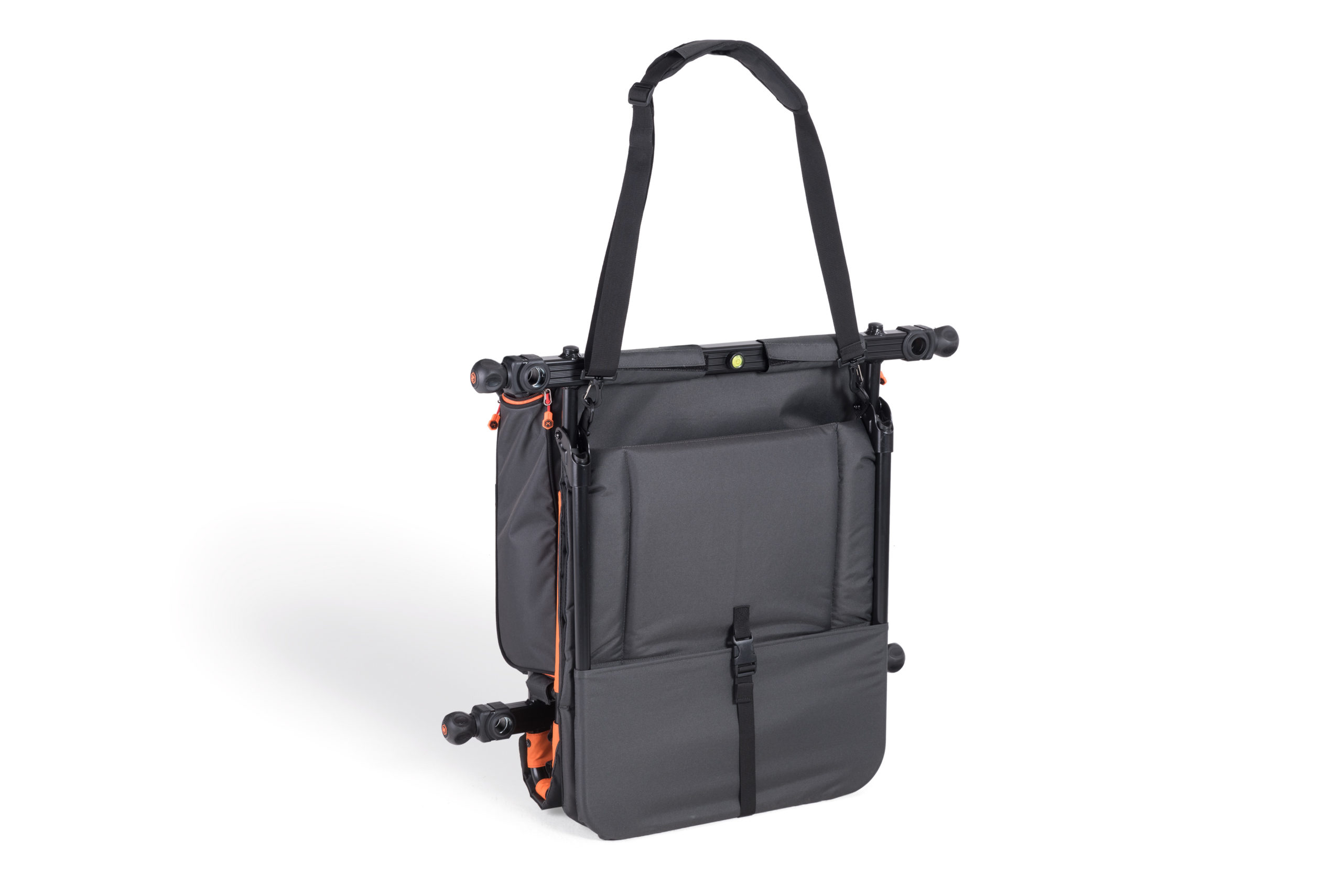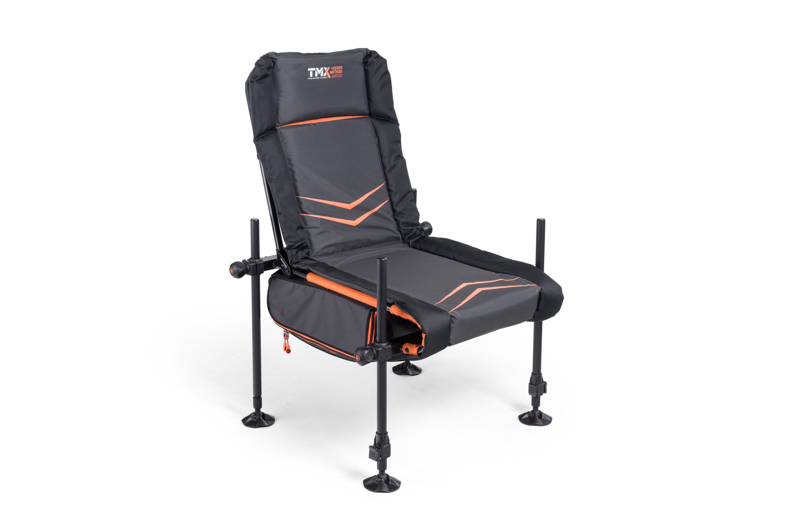 Comfortable, perfectly stable, and easy to transport – that’s the Feeder Station TMX. The ergonomic design of the seat and backrest, together with a well-padded mattress, ensures comfortable sitting. Four adjustable legs adapt to any uneven terrain, and the built-in spirit level allows you to quickly set the seat perfectly level. On steep banks, you will appreciate the front telescopic legs and high-quality swivel mud feet that prevent sinking. There is a large storage compartment under the seat, ideal for storing side trays, rod rests, and other accessories. During transport, the legs can be inserted into dedicated holders in the rounded front section of the seat. The backrest can be easily folded down and secured in place with the provided clip. An adjustable shoulder strap for carrying is also included.