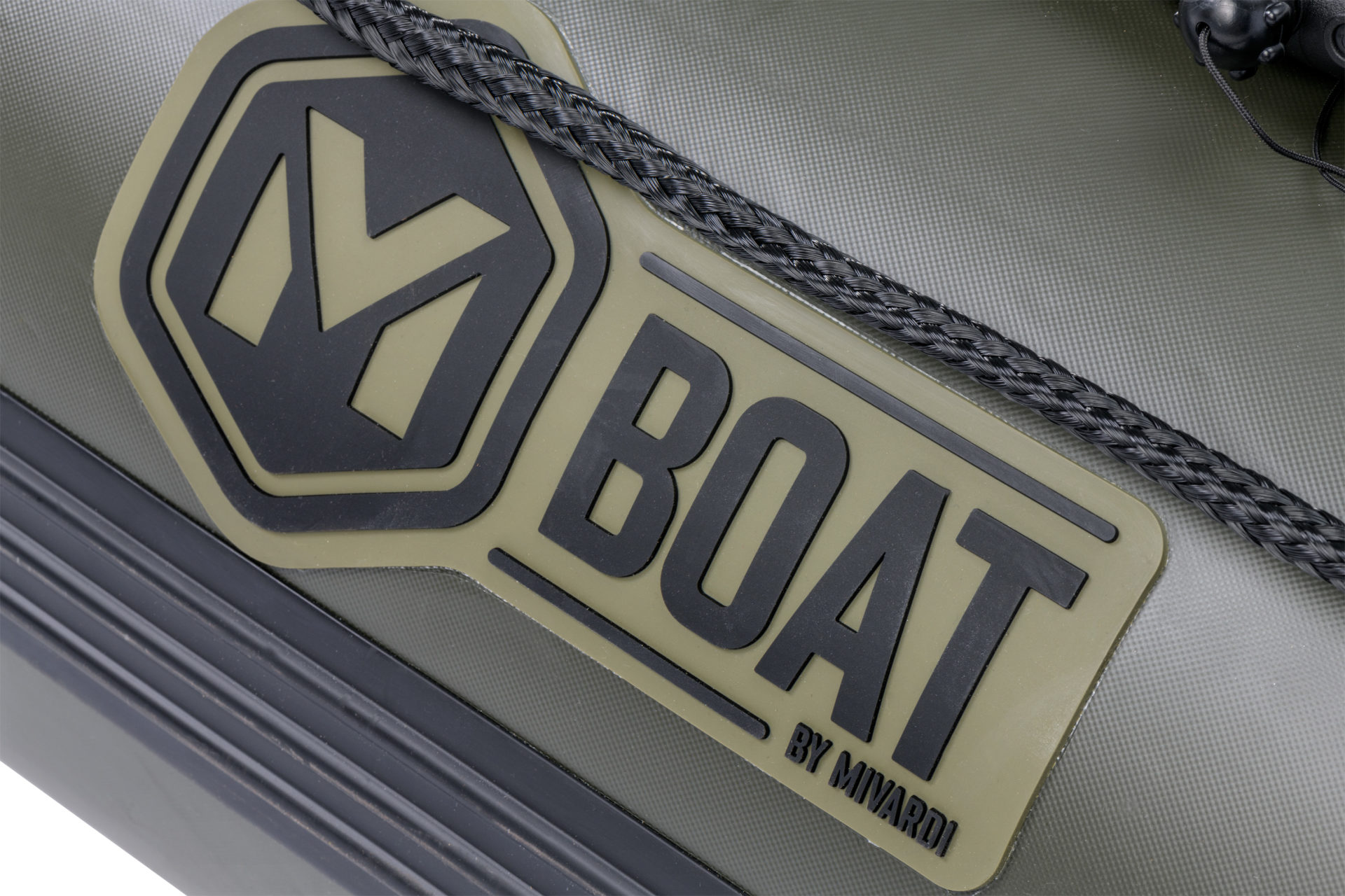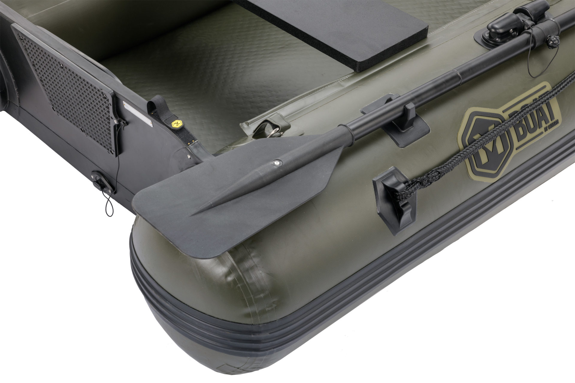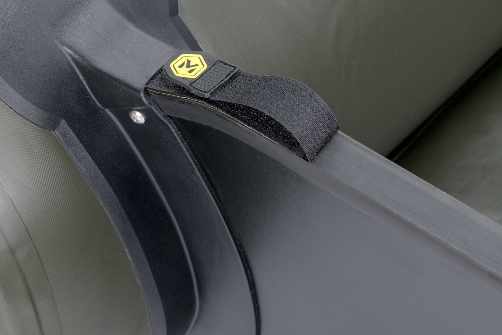 The second generation of M-BOAT AWB inflatable boats retains all the advantages and unique features of this model while adding a range of improvements. The above-standard width and specific shape of the boat ensure an extremely large internal space, which is always significantly larger than that of standard boats of the same length on the market. This is further enhanced by the specific design of the rear part of the pontoons, allowing the transom to be placed as close to the end of the pontoons as possible while maintaining their function in keeping the direction of travel. The significantly raised bow, along with the specially shaped front section, a robust inflatable keel running the entire length of the floor, and the specially designed transom, provide excellent hydrodynamic properties and directional stability. In practice, this means higher speed, easier handling, and lower energy consumption when powering the boat. The reinforced material of the pontoons increases resistance to punctures. The inflatable floor with a double tread layer is almost indestructible, and its green colour harmonises well with the boat’s colouring and black oars and other accessories. Each boat is equipped with Velcro straps in the front section and on the transom. There is also a heavy duty accessory strap in the middle section.