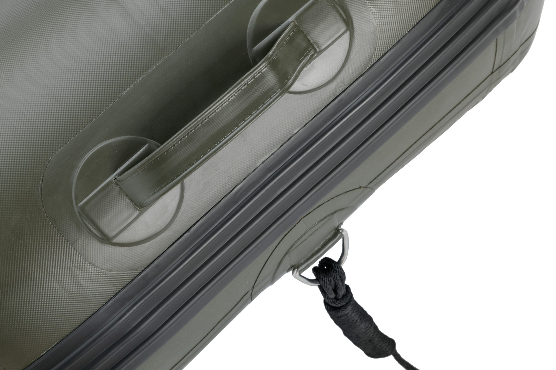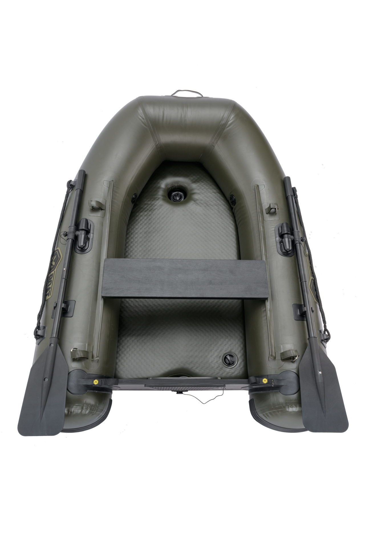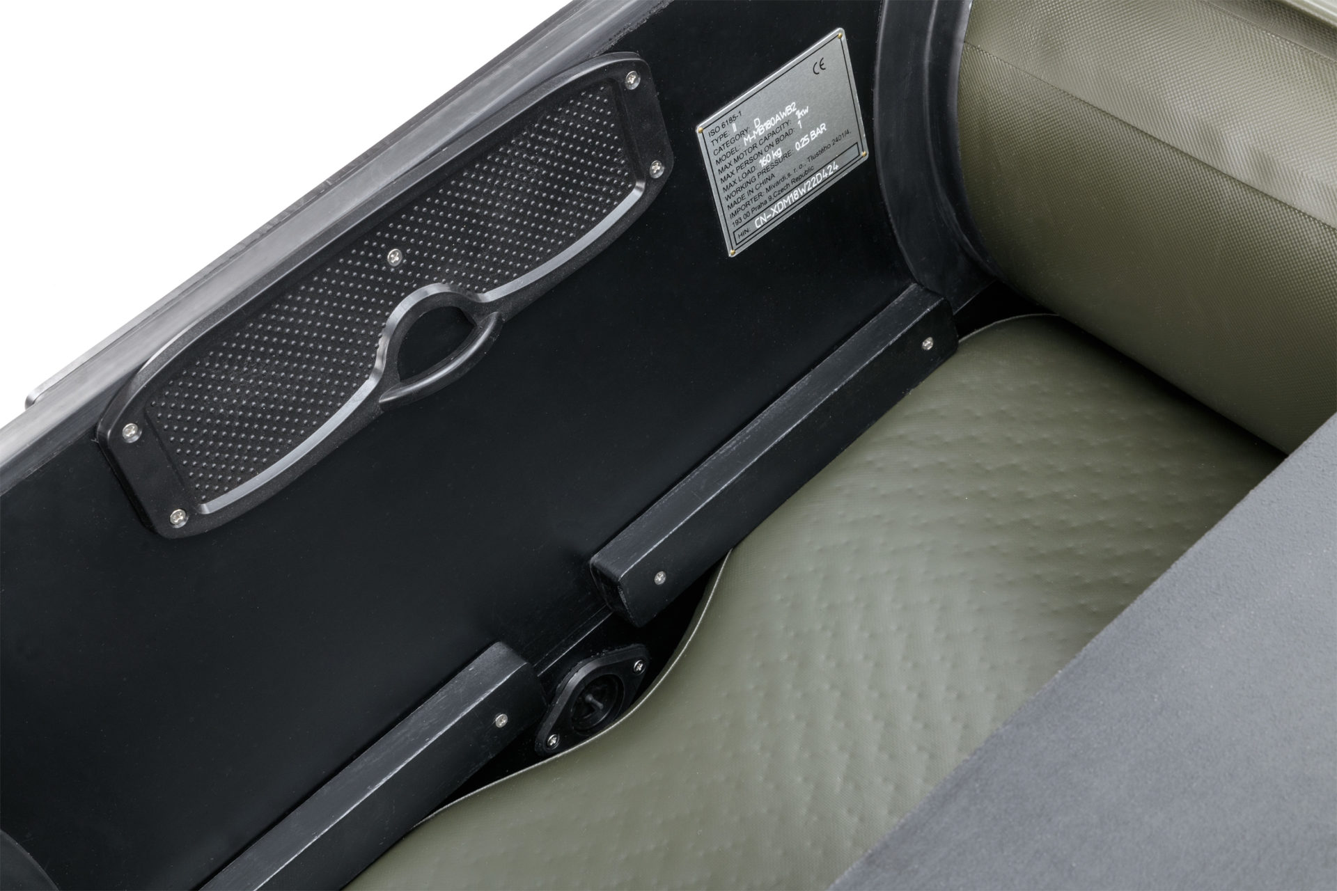 The second generation of M-BOAT AWB inflatable boats retains all the advantages and unique features of this model while adding a range of improvements. The above-standard width and specific shape of the boat ensure an extremely large internal space, which is always significantly larger than that of standard boats of the same length on the market. This is further enhanced by the specific design of the rear part of the pontoons, allowing the transom to be placed as close to the end of the pontoons as possible while maintaining their function in keeping the direction of travel. The significantly raised bow, along with the specially shaped front section, a robust inflatable keel running the entire length of the floor, and the specially designed transom, provide excellent hydrodynamic properties and directional stability. In practice, this means higher speed, easier handling, and lower energy consumption when powering the boat. The reinforced material of the pontoons increases resistance to punctures. The inflatable floor with a double tread layer is almost indestructible, and its green colour harmonises well with the boat’s colouring and black oars and other accessories. Each boat is equipped with Velcro straps in the front section and on the transom. There is also a heavy duty accessory strap in the middle section.