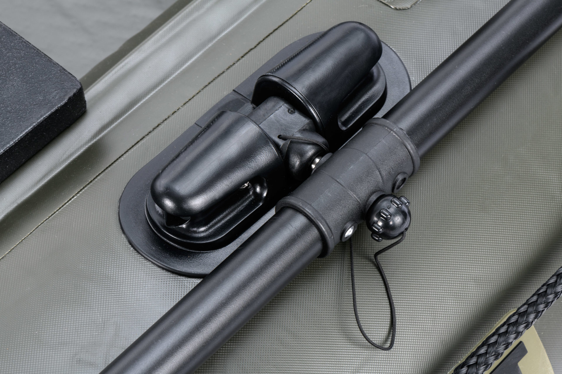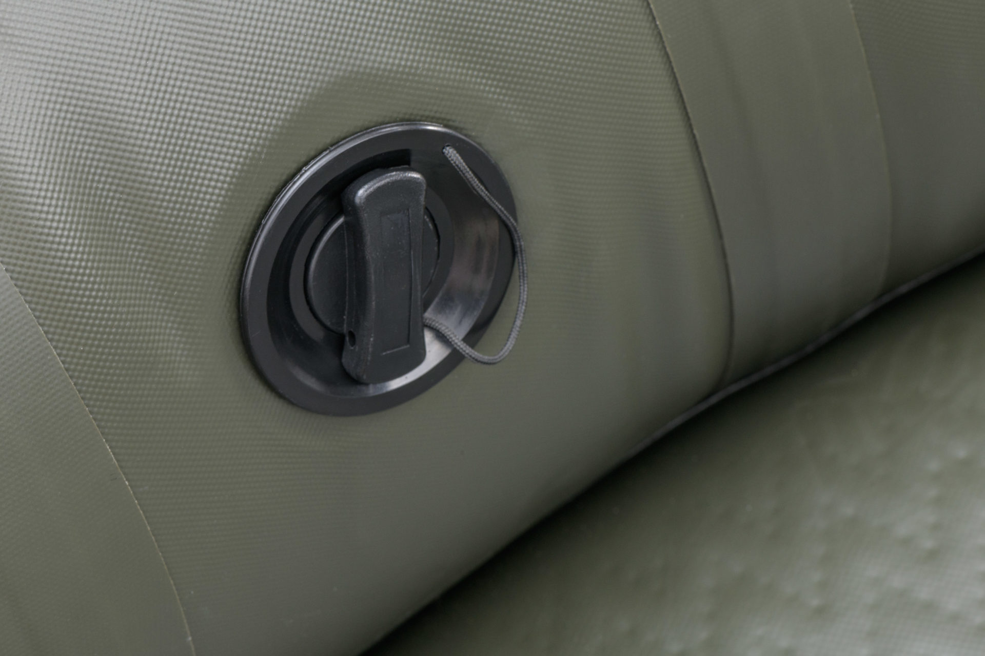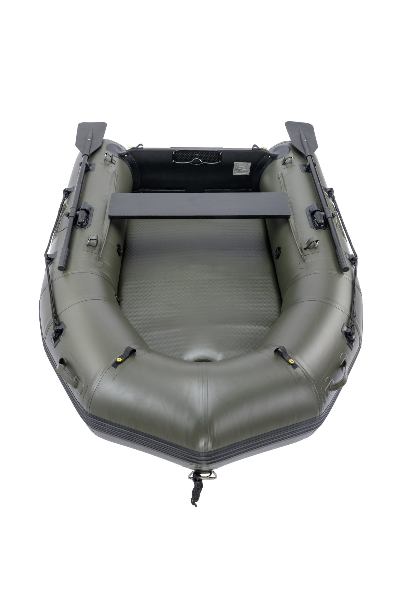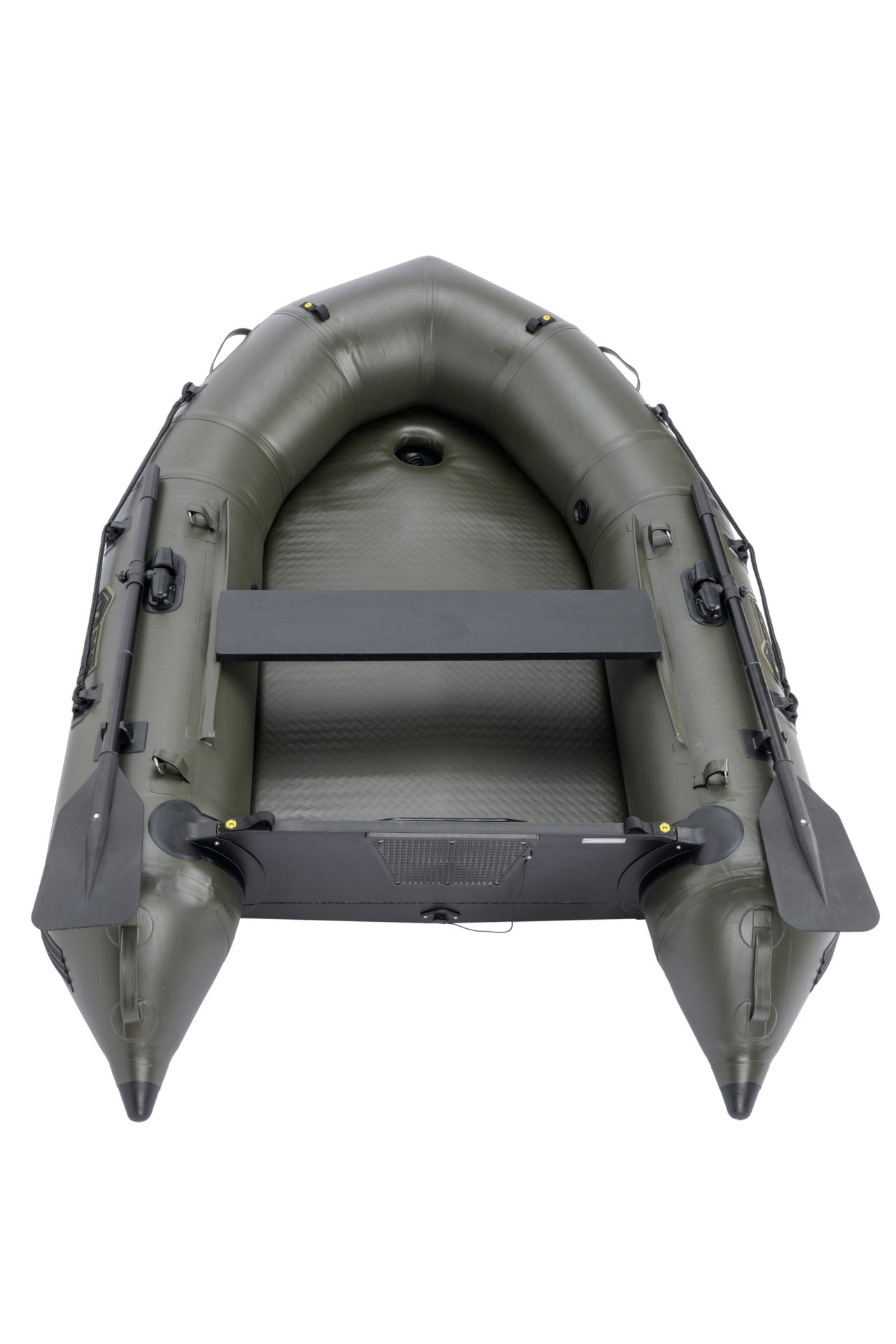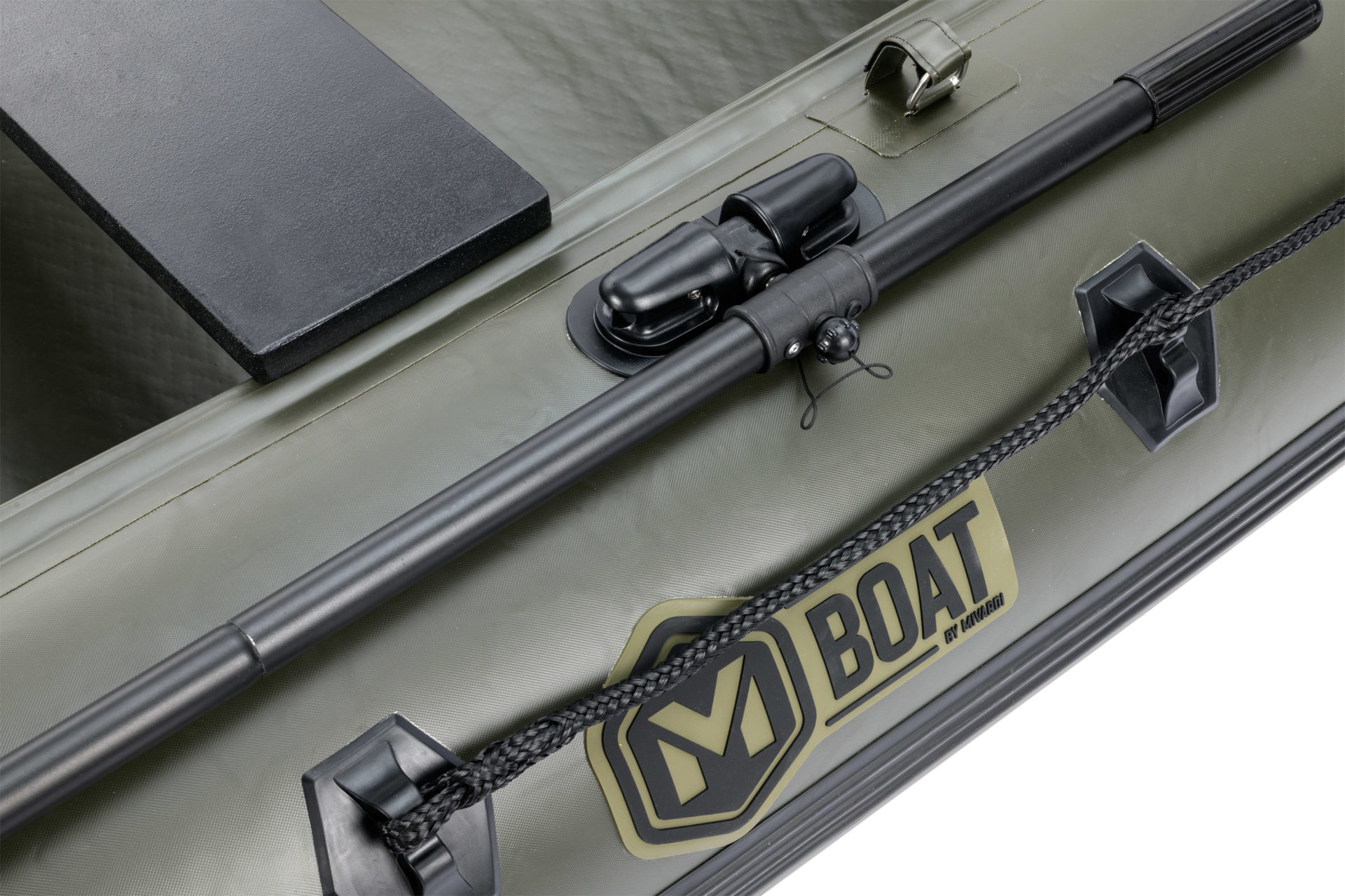 The second generation of M-BOAT AWB inflatable boats retains all the advantages and unique features of this model while adding a range of improvements. The above-standard width and specific shape of the boat ensure an extremely large internal space, which is always significantly larger than that of standard boats of the same length on the market. This is further enhanced by the specific design of the rear part of the pontoons, allowing the transom to be placed as close to the end of the pontoons as possible while maintaining their function in keeping the direction of travel. The significantly raised bow, along with the specially shaped front section, a robust inflatable keel running the entire length of the floor, and the specially designed transom, provide excellent hydrodynamic properties and directional stability. In practice, this means higher speed, easier handling, and lower energy consumption when powering the boat. The reinforced material of the pontoons increases resistance to punctures. The inflatable floor with a double tread layer is almost indestructible, and its green colour harmonises well with the boat’s colouring and black oars and other accessories. Each boat is equipped with Velcro straps in the front section and on the transom. There is also a heavy duty accessory strap in the middle section.