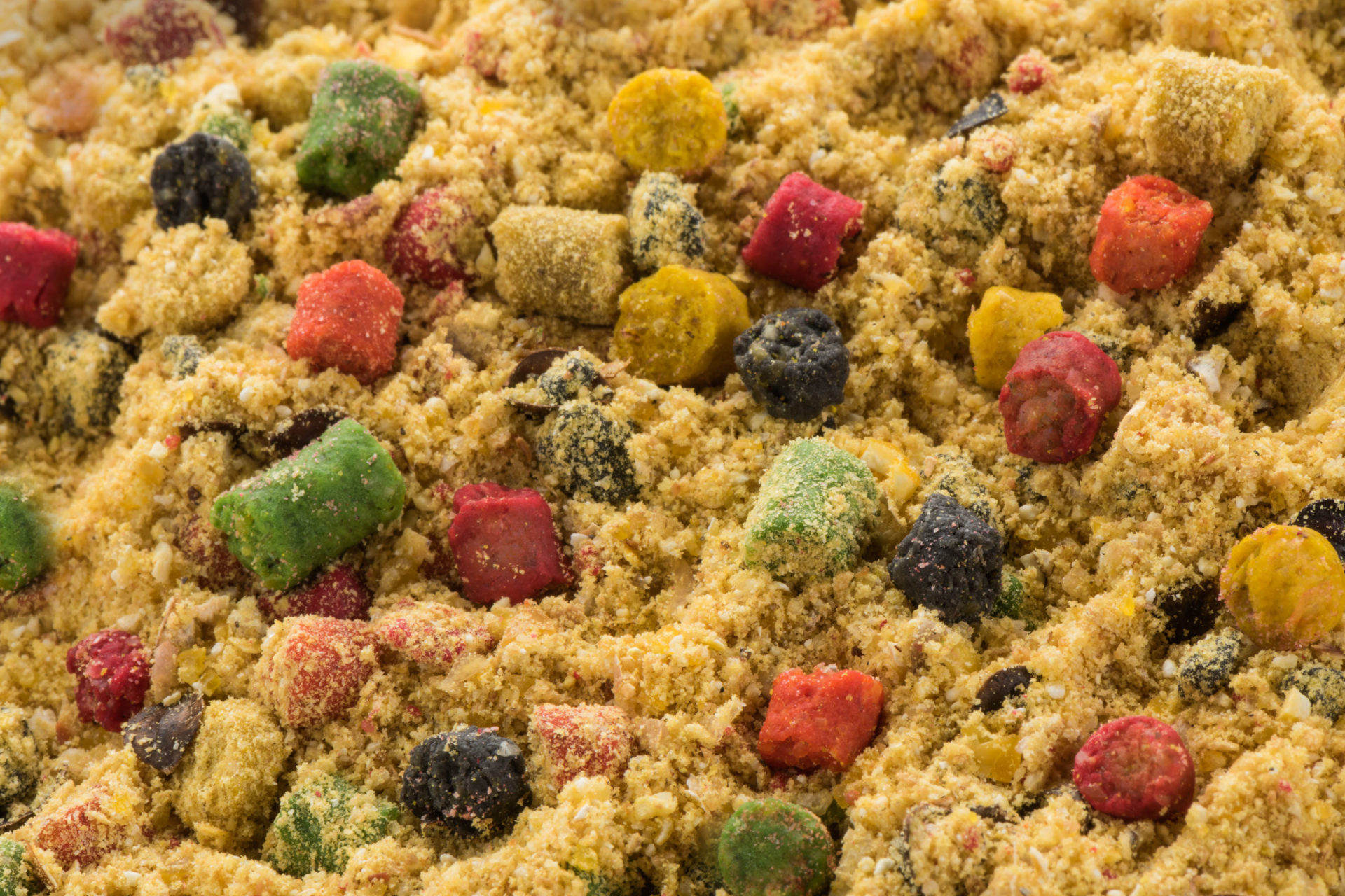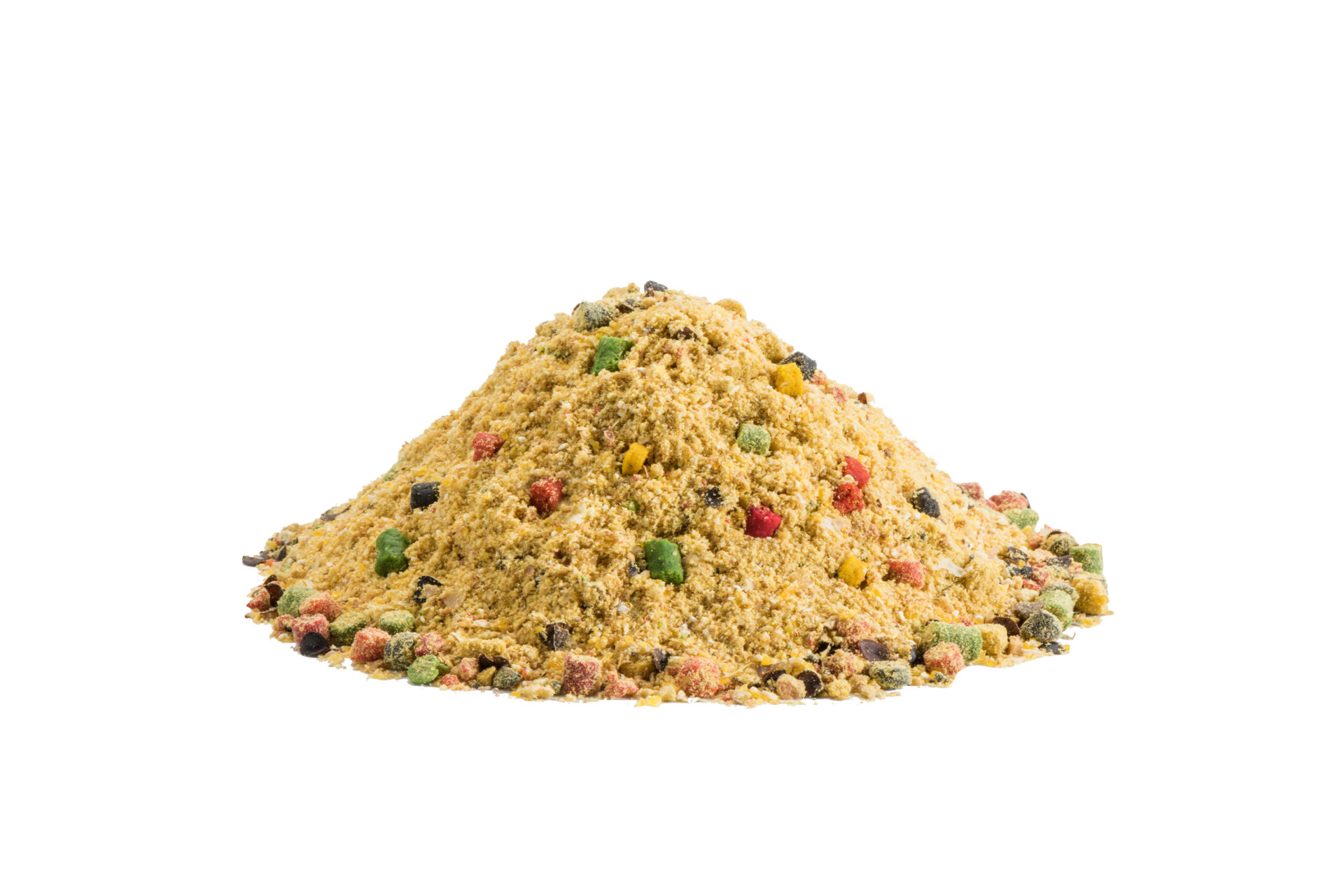 R1 mixes include pellets in various colors, enhancing the visual stimulation of fish. They are also enriched with ground wafers, ensuring perfect stickiness and optimal consistency in water. Specially selected taste stimulants, such as corn, biscuits, and breadcrumbs, increase the mix’s attractiveness and promote active feeding.