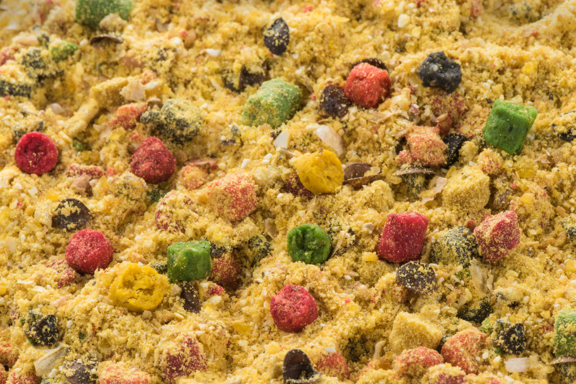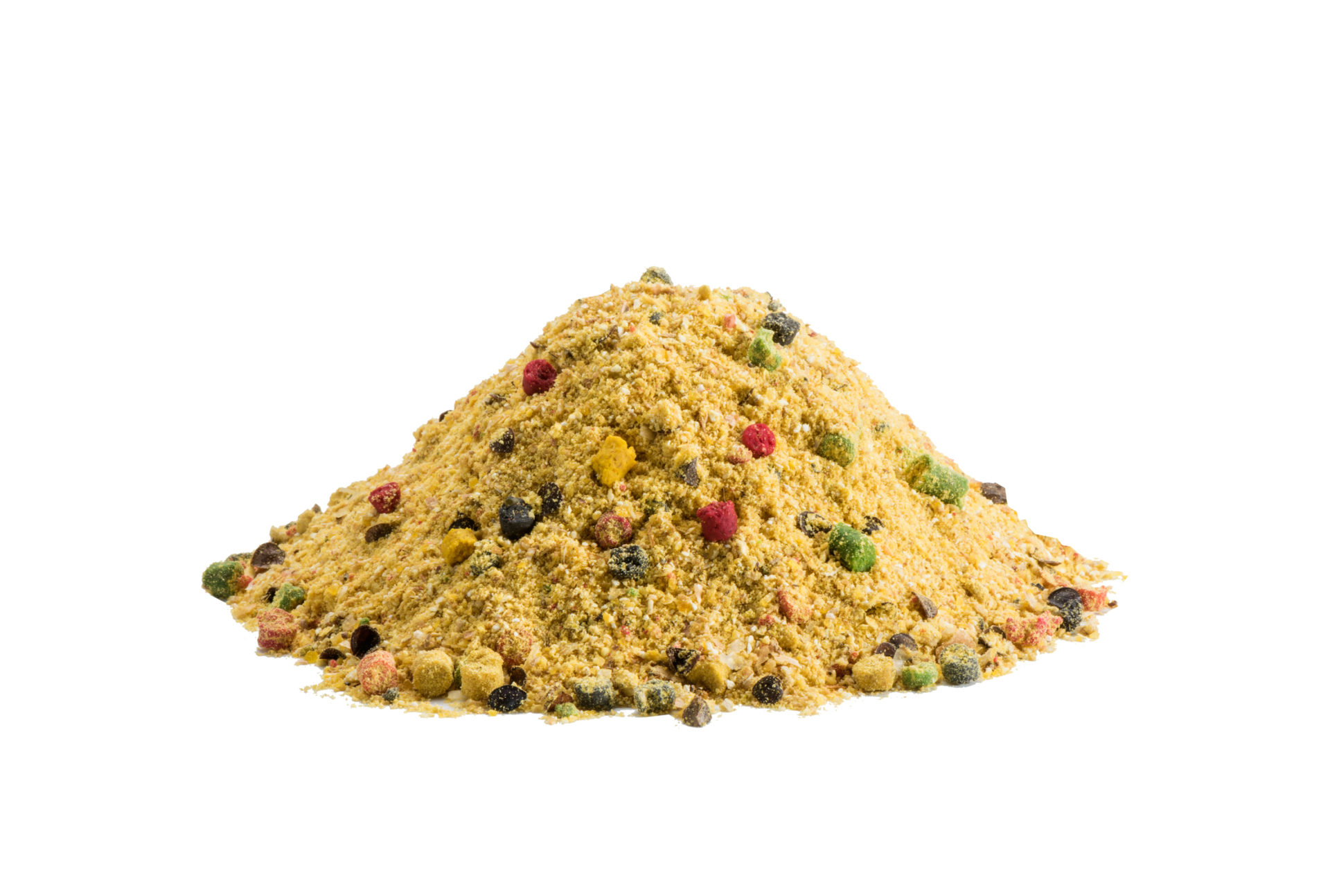 R1 mixes include pellets in various colors, enhancing the visual stimulation of fish. They are also enriched with ground wafers, ensuring perfect stickiness and optimal consistency in water. Specially selected taste stimulants, such as corn, biscuits, and breadcrumbs, increase the mix’s attractiveness and promote active feeding.