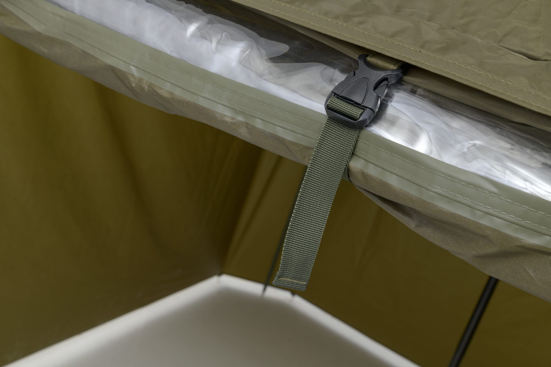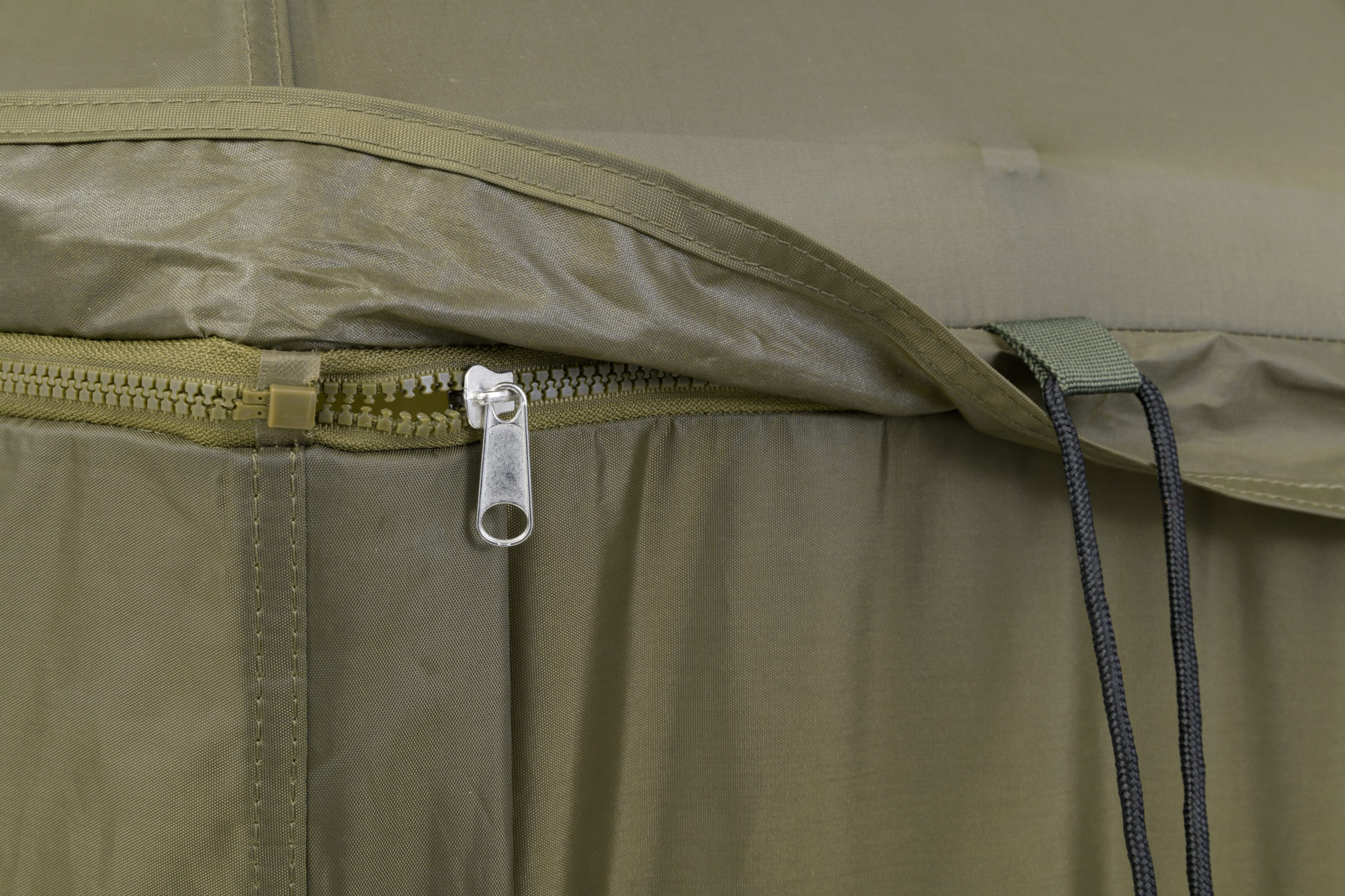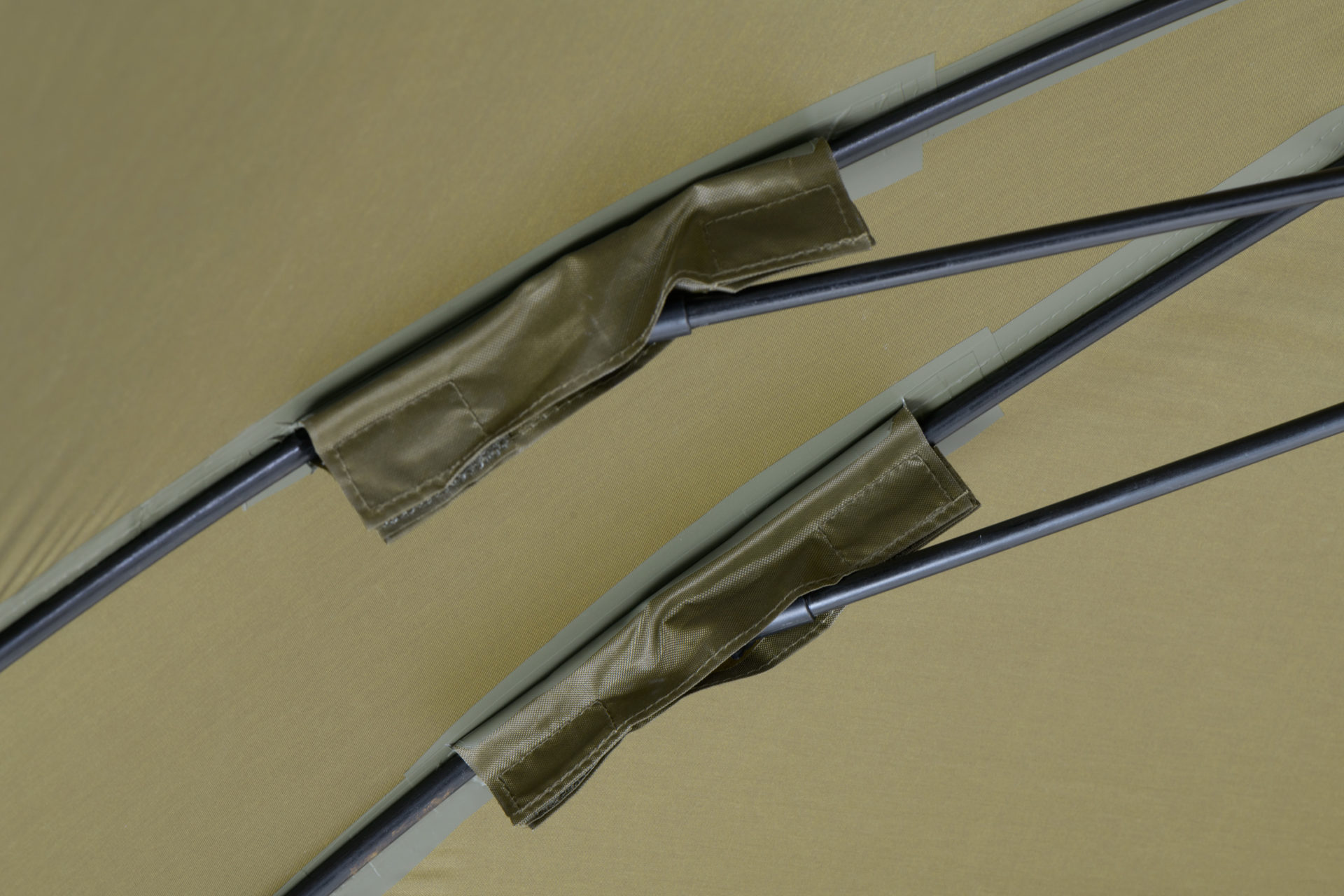 A fully covered, square-shaped umbrella of giant proportions. It can accommodate two large bedchairs. The dimensions of the umbrella are fully accommodated by its design and the materials used. The frame is made of sturdy and flexible fiberglass ribs, which, in addition to high rigidity and stability, ensure great durability. This is particularly appreciated in strong winds, when standard wire ribs would be deformed or completely destroyed. The high-quality nylon canopy offers very low weight, an uncompromising water column of 8000mm, and completely taped seams. The side panel is attached all around with a robust zipper, covered by a drip edge. The front panel, featuring a large window, can be easily unzipped and rolled up. In windy conditions, the umbrella can be stabilized using four anchoring ropes. This umbrella comes with a set of heavy-duty bivvy pegs for perfect anchoring even in difficult conditions. A great addition to this umbrella is a unique stabilization kit for extreme conditions, available separately.