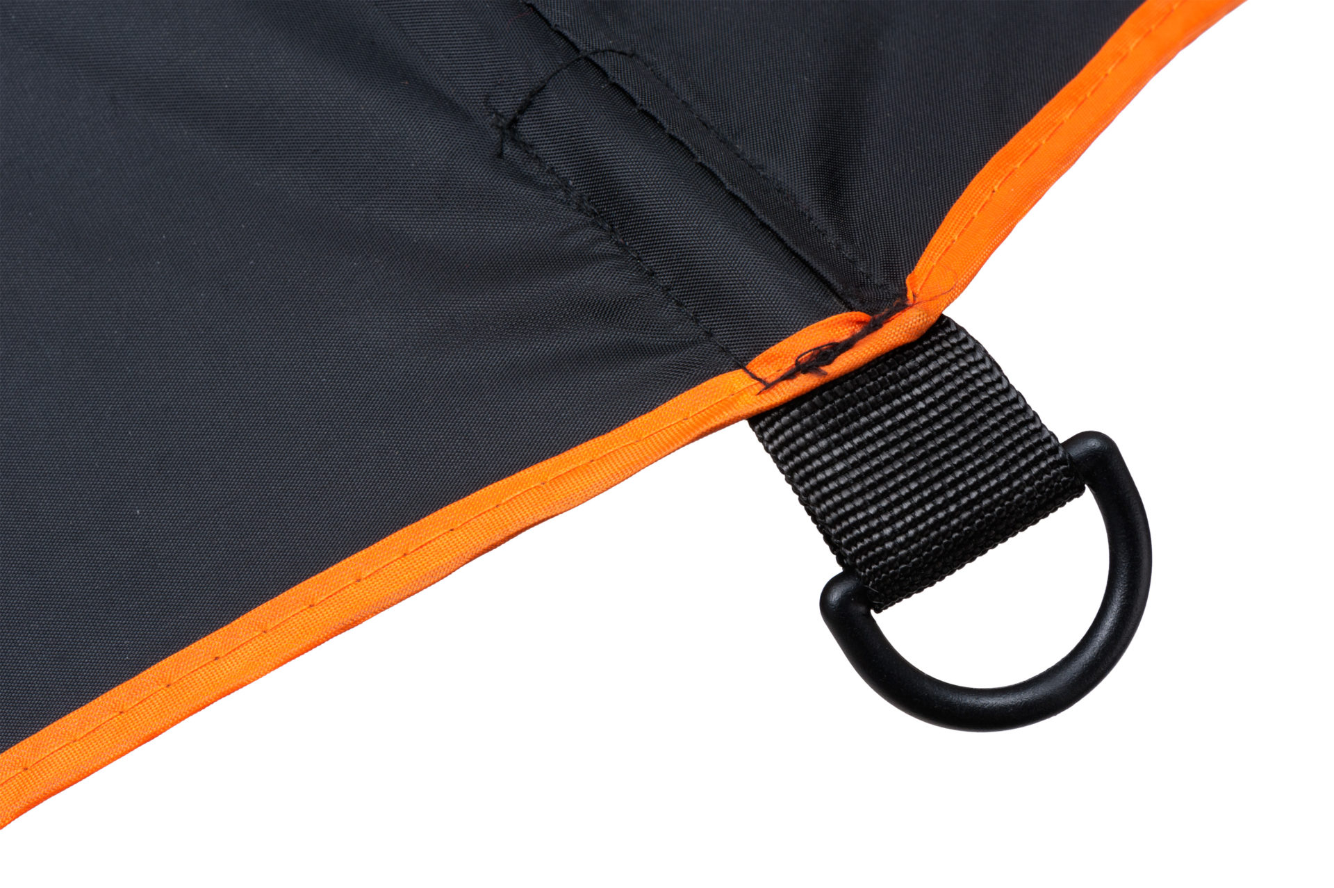 A high-quality, large round umbrella. The canopy, featuring an attractive TMX design, is made of completely waterproof PVC coated nylon and fully taped seams. It is equipped with a reliable tilting joint, a sturdy pole, and anchoring ropes for stabilisation in strong winds.