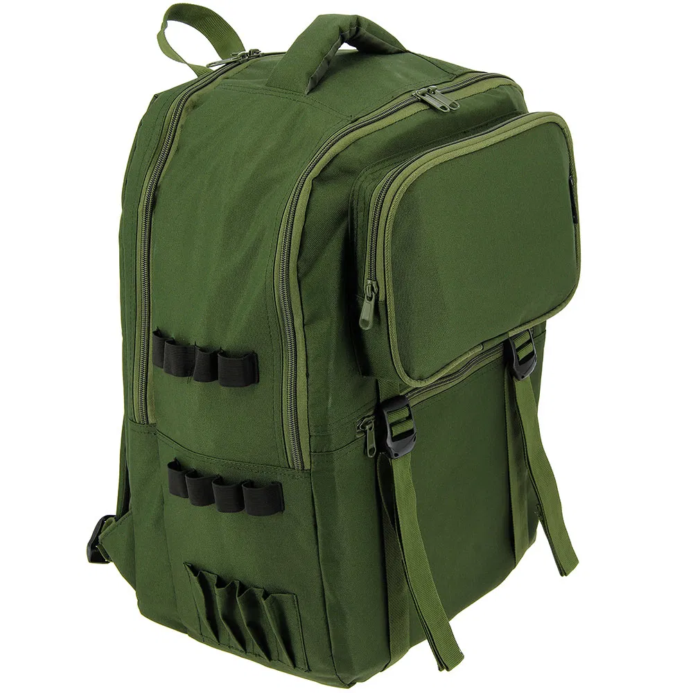 Plecak wędkarski Angling Pursuits 31x46x22 cm – model outdoor/fishing Opis produktu: Solidny i funkcjonalny plecak zaprojektowany z myślą o zastosowaniu wędkarskim i outdoorowym. Idealny dla wędkarzy preferujących mobilność, zasiadki, wyprawy spinningowe oraz biwakowanie. Sprawdzi się również jako uniwersalny plecak terenowy do codziennego użytku. Cechy techniczne: Materiał: gruba, wytrzymała tkanina odporna na przetarcia i wilgoć Wymiary zewnętrzne: 31 x 46 x 22 cm Pojemna komora główna z podwójnym zamkiem – pomieści odzież, sprzęt, akcesoria Dwie kieszenie przednie (górna i dolna) – na mniejsze elementy ekwipunku Dwie boczne kieszenie z siatki – np. na butelki, atraktory, akcesoria podręczne Elastyczne pętle boczne – do mocowania podpórek, kijków, podbieraka Regulowane pasy kompresyjne z przodu – umożliwiają przypięcie śpiwora, karimaty, namiotu Miękkie, regulowane szelki oraz wzmocniony uchwyt górny zapewniają wygodę noszenia Kolorystyka: stonowana, terenowa (np. zieleń/oliwka – zależnie od partii) Zastosowanie: Wędkarstwo karpiowe, gruntowe, feederowe, spinningowe Zasiadki jedno- i wielodniowe Użytkowanie outdoorowe i turystyczne
