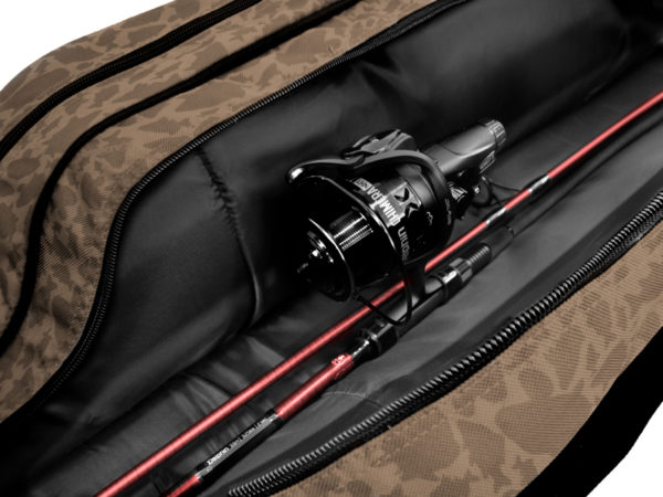Ściany pokrowca są dokładnie wyściełane wyściółką o grubości 6 mm, a wewnętrzna przestrzeń zapewnia dużo miejsca do wygodnego przechowywania wędek karpiowych z kołowrotkami. Nawet wędki z przelotkami 50 mm z łatwością zmieszczą się w pokrowcu. Każda komora posiada osobny otwór zapinany na zamek, co zapewnia, że wędki są od siebie odseparowane przez cały czas i doskonale przymocowane za pomocą praktycznych pasków na rzepy w dolnej części pokrowca. Dzięki wyżej wymienionym zaletom gwarantujemy, że sprzęt znajdujący się wewnątrz jest w pełni chroniony podczas transportu i przenoszenia.