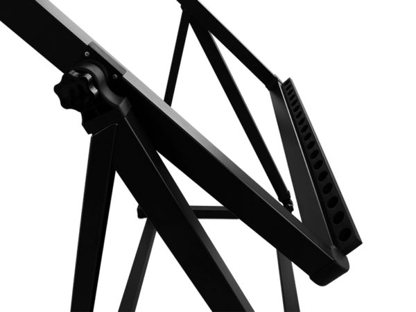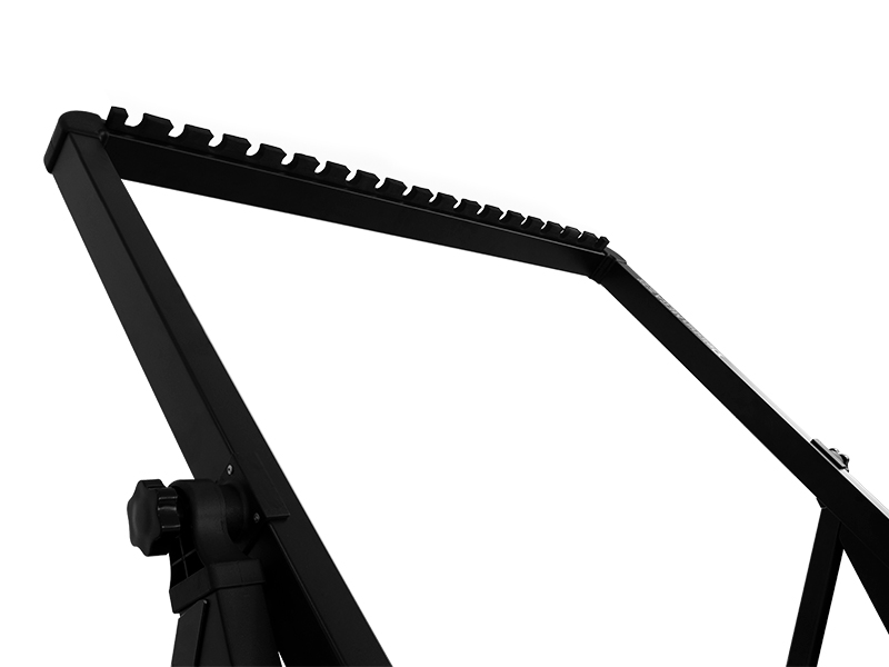 Wykonany z masywnych profili aluminiowych zapewniających stabilność i trwałość. Główną część stojaka można odchylić, aby dopasować go do przestrzeni, w której chcemy go wyeksponować. Szczeliny na wędki wykonane są z pianki, aby chronić wędki i równo podzielić przestrzeń między nimi.